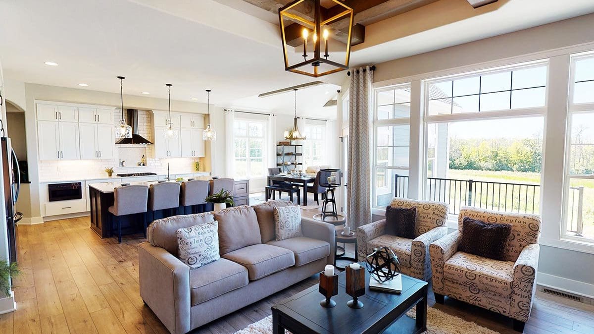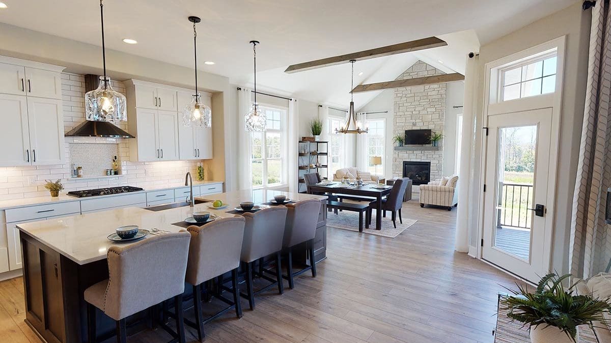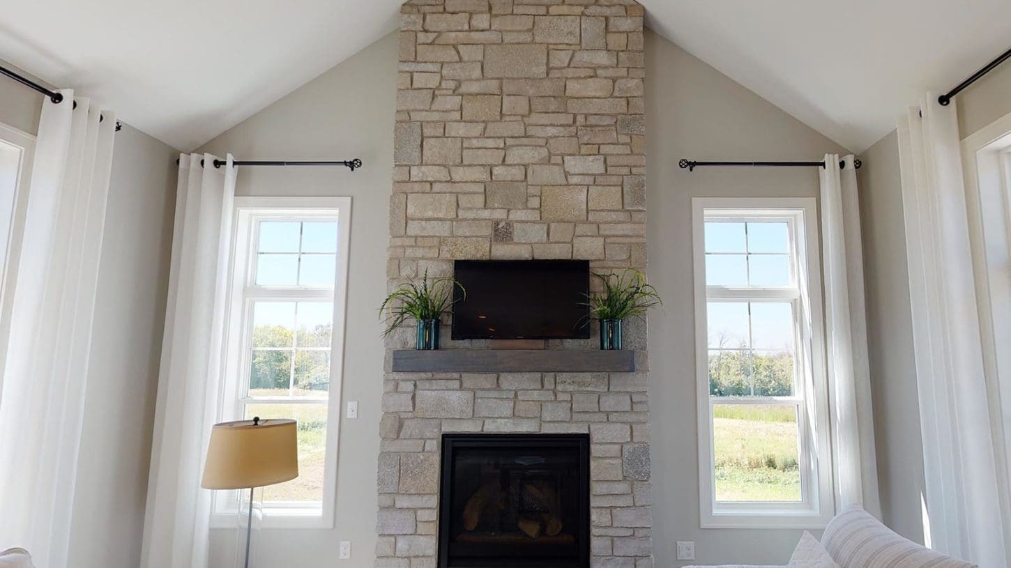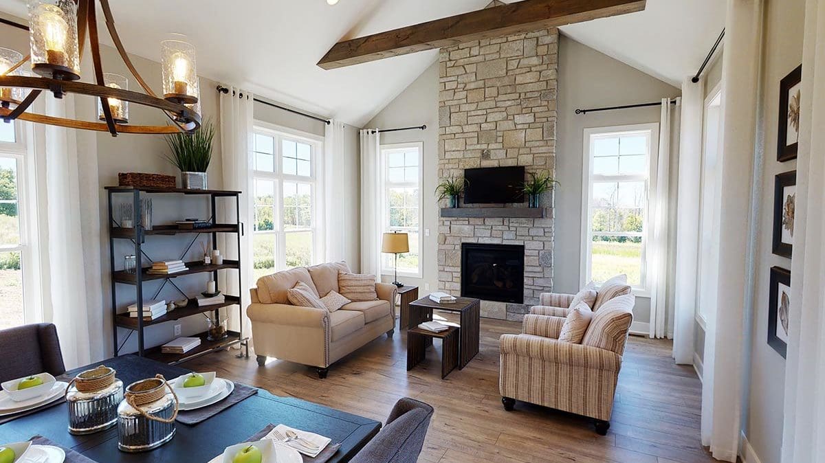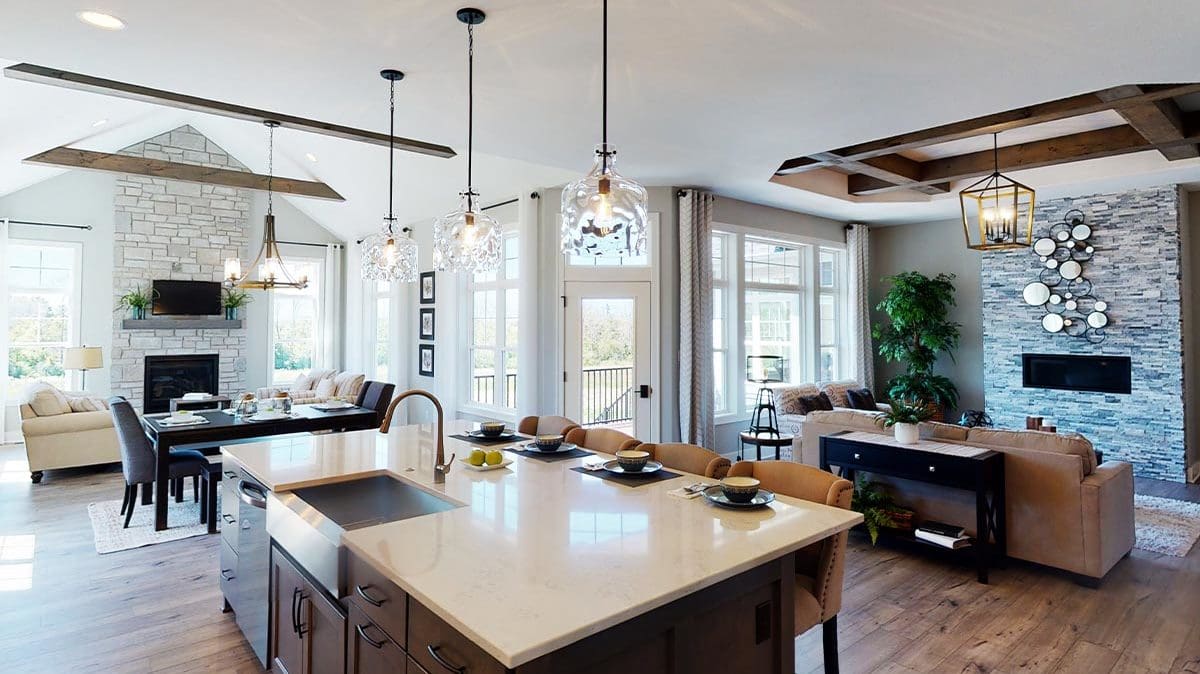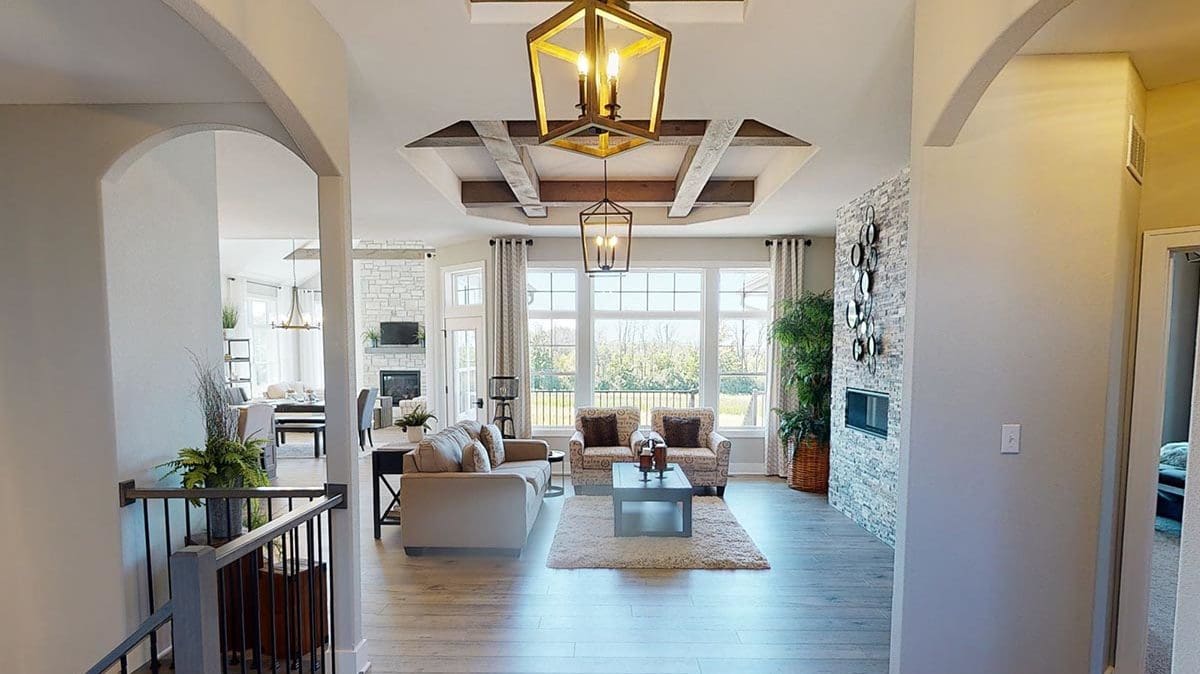 A welcoming foyer draws you into the heart of the Dakota, where you’ll find 10’ high ceilings, an abundance of stately windows, and wood beam ceiling treatments throughout. The great room is highlighted by an impressive stone/wood fireplace and expansive entertaining space that flows into the kitchen. The kitchen is tastefully appointed in every way with impressive maple painted cabinets, over-sized island, stainless steel apron sink, and quartz counter tops. The kitchen features a walk-in pantry, induction cook top, and built-in double-ovens. The dinette right off the kitchen opens up to a cozy hearth room that focuses on a dramatic fireplace. An impressive cathedral ceiling with a unique truss ceiling treatment makes this space a favorite room.
