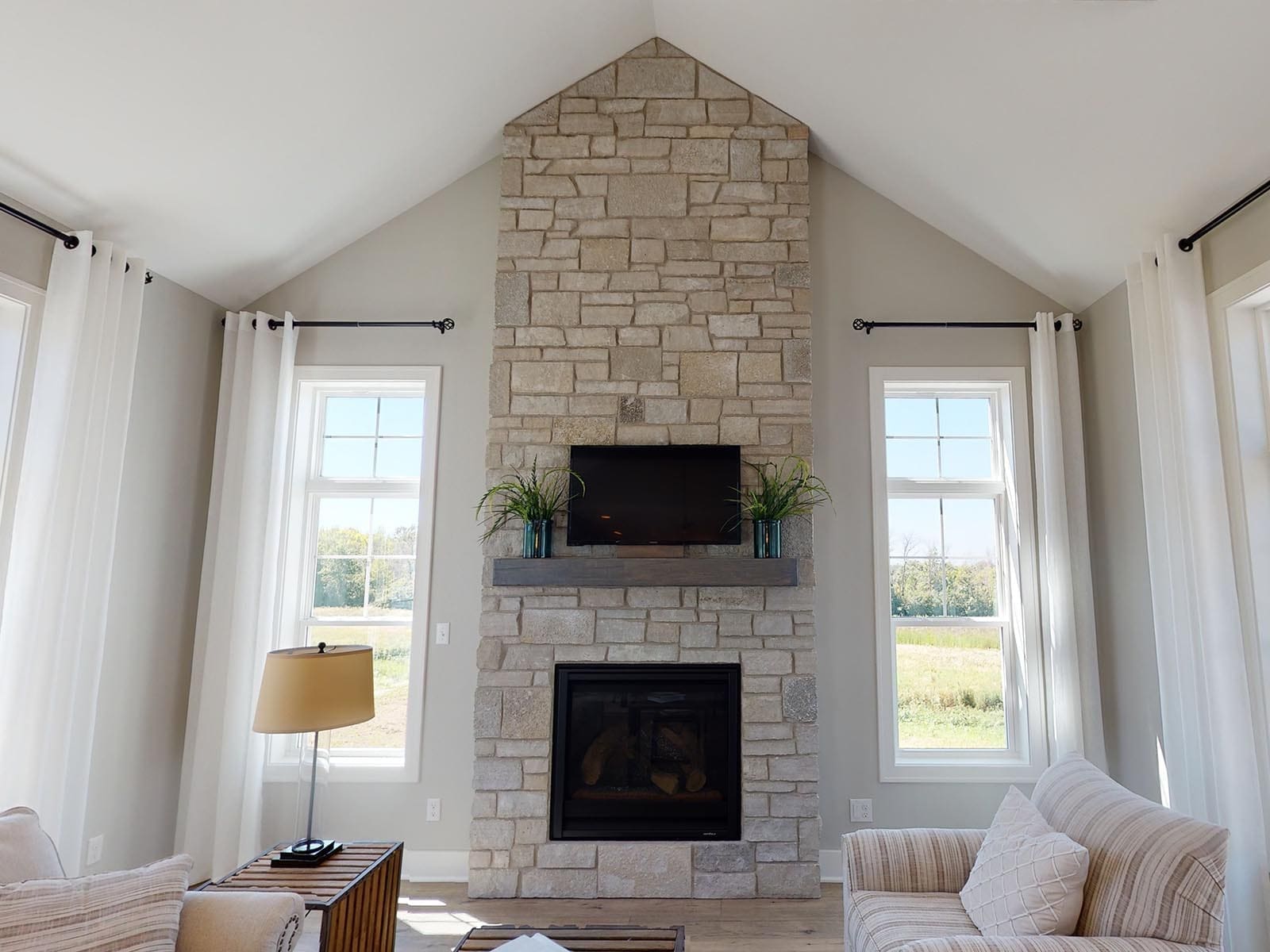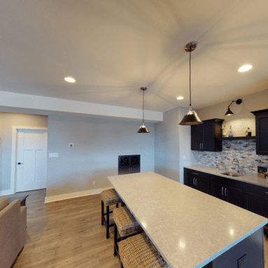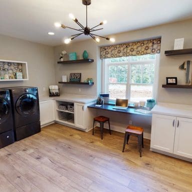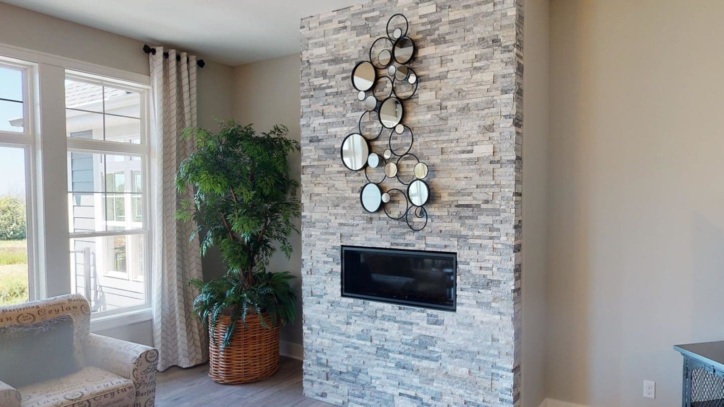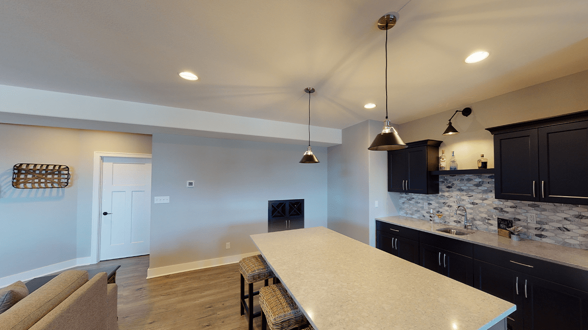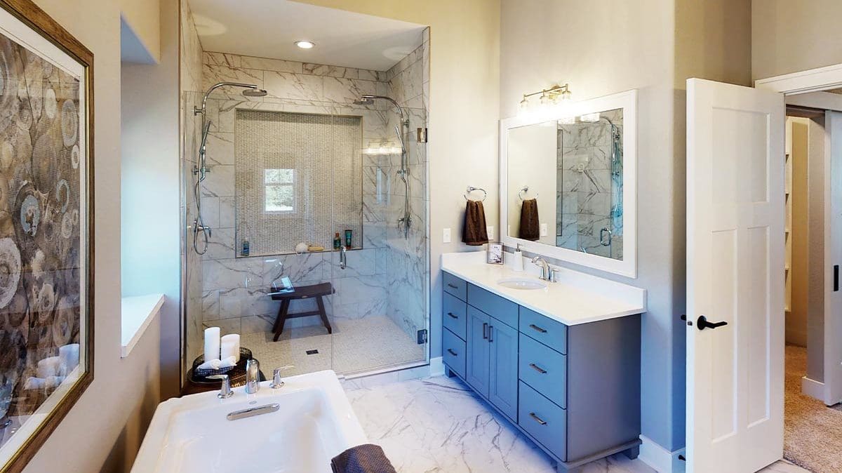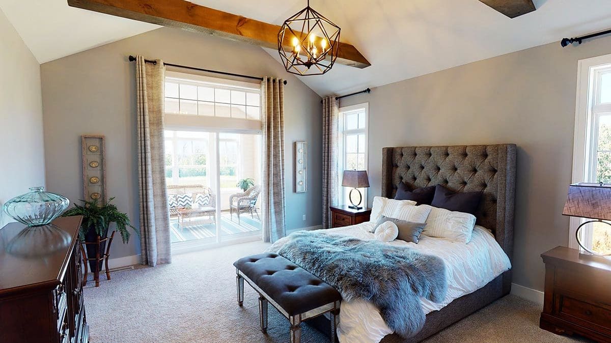 A welcoming foyer draws you into the heart of the Dakota, where you’ll find 10’ high ceilings, an abundance of stately windows, and wood beam ceiling treatments throughout. The great room is highlighted by an impressive stone/wood fireplace and expansive entertaining space that flows into the kitchen. The kitchen is tastefully appointed in every way with impressive maple painted cabinets, over-sized island, stainless steel apron sink, and quartz counter tops. The kitchen features a walk-in pantry, induction cook top, and built-in double-ovens. The dinette right off the kitchen opens up to a cozy hearth room that focuses on a dramatic fireplace. An impressive cathedral ceiling with a unique truss ceiling treatment makes this space a favorite room.