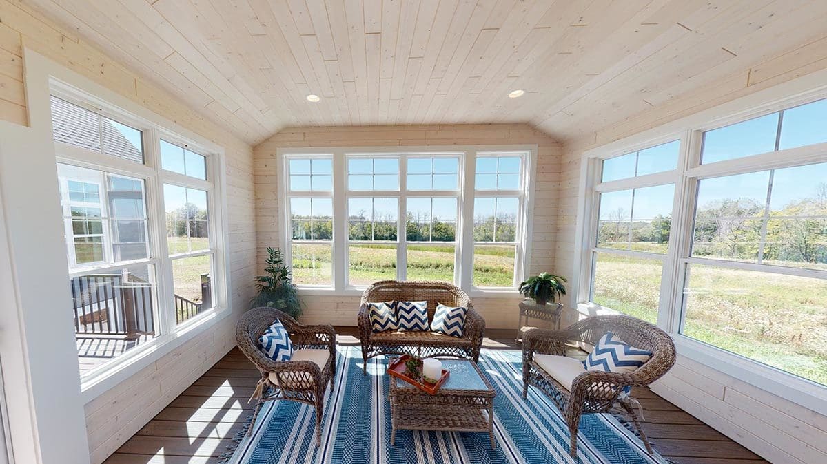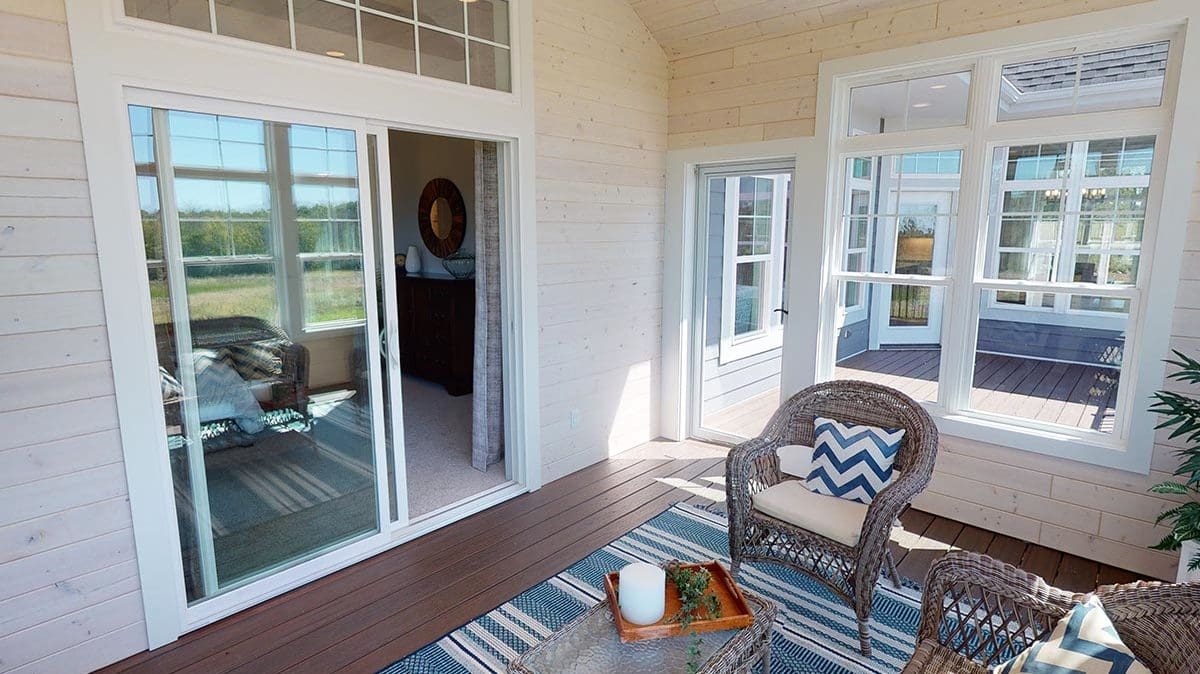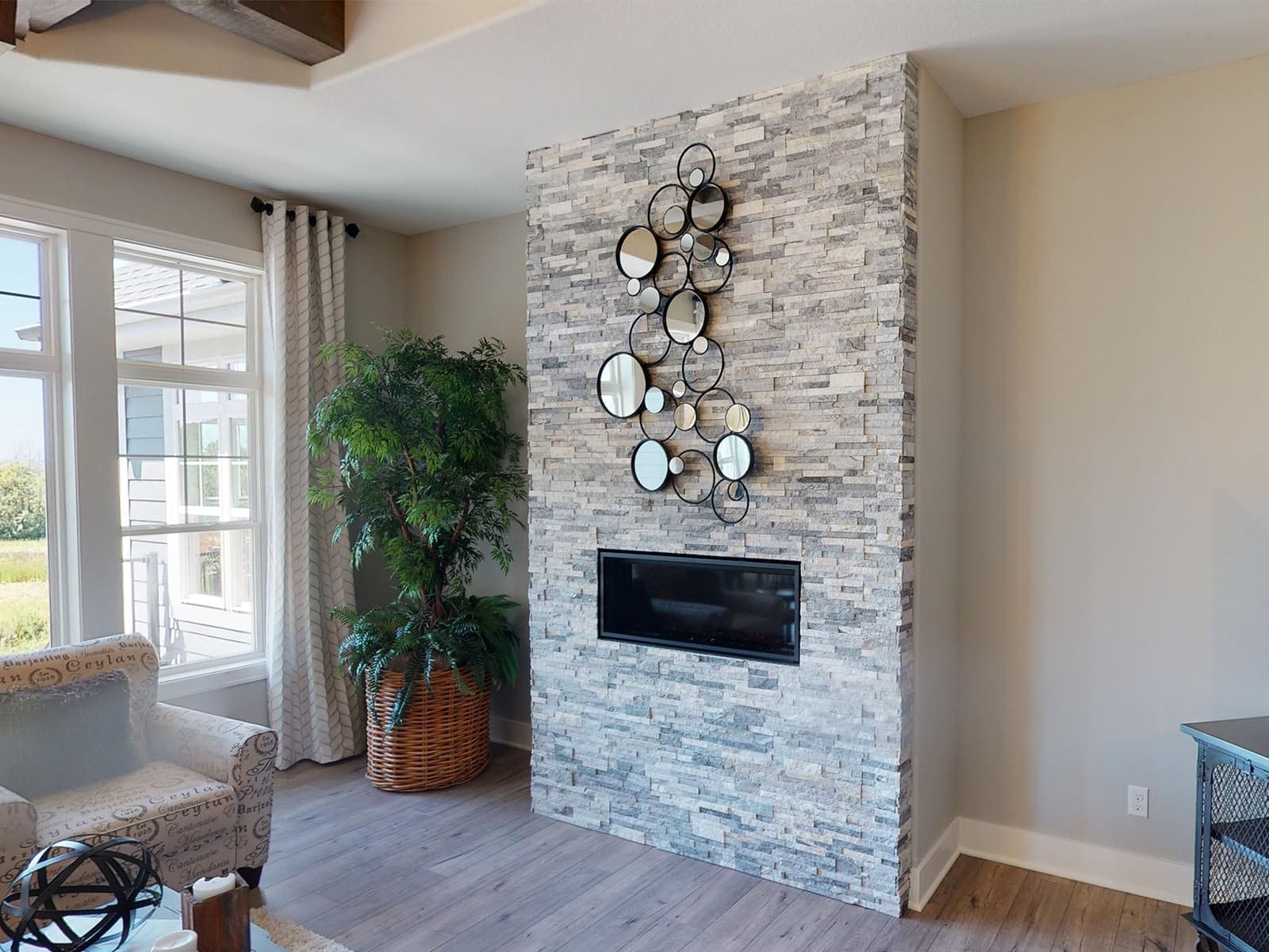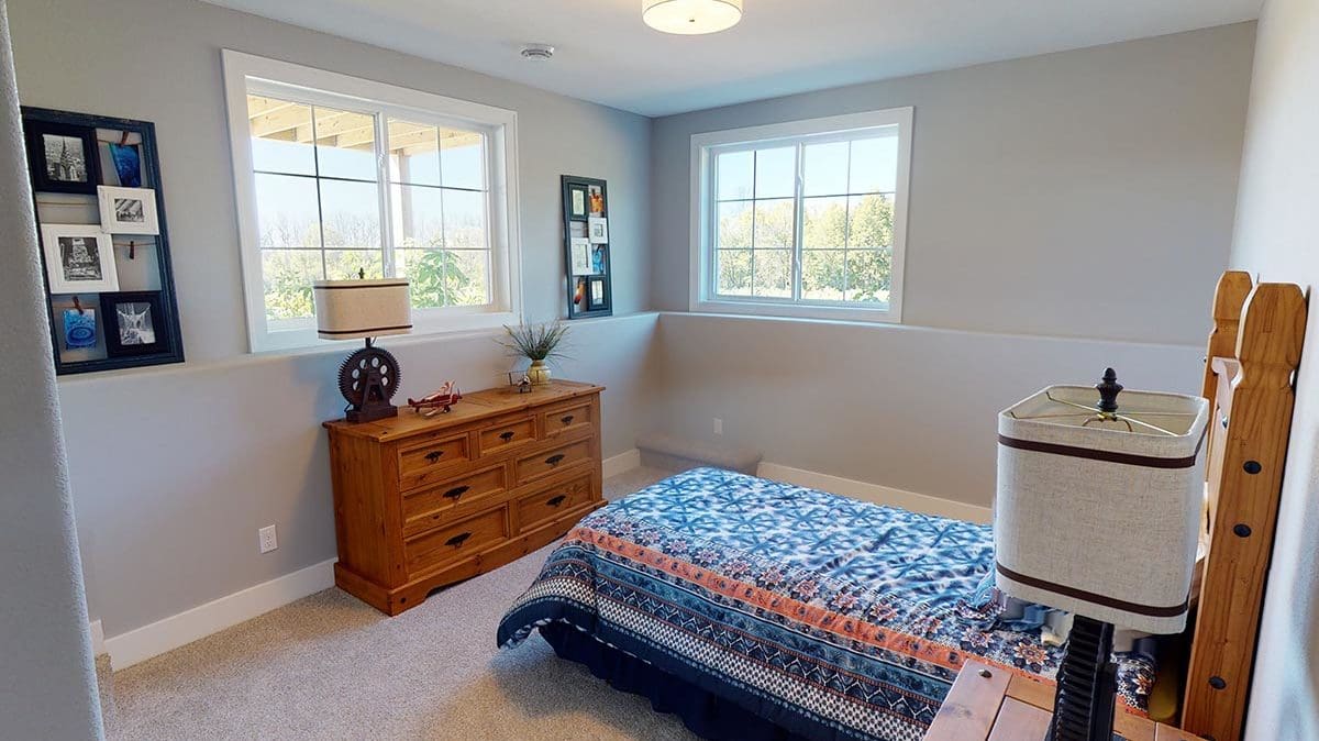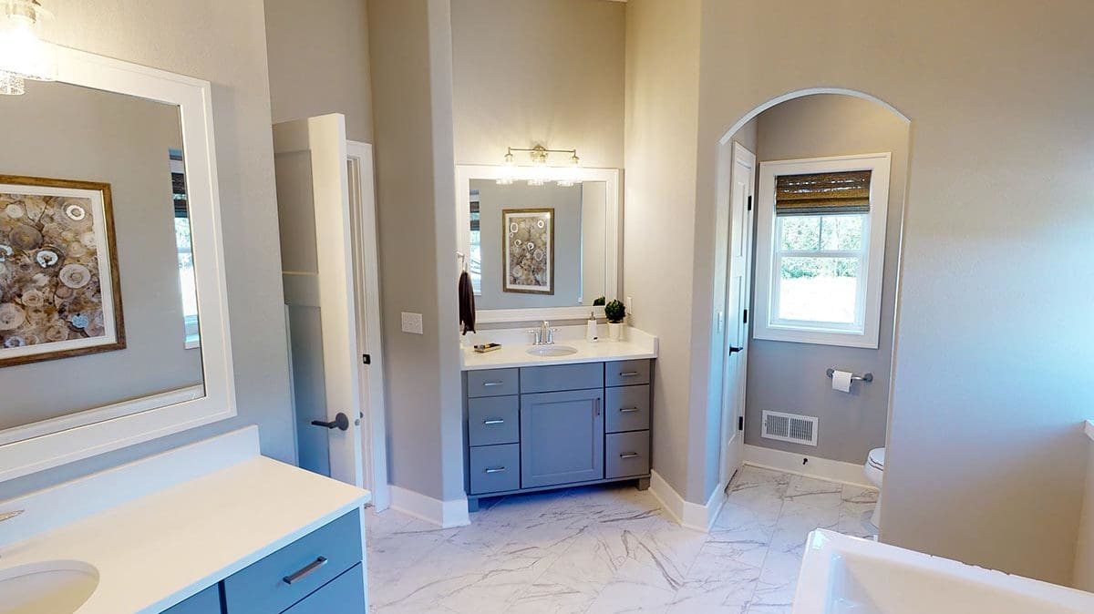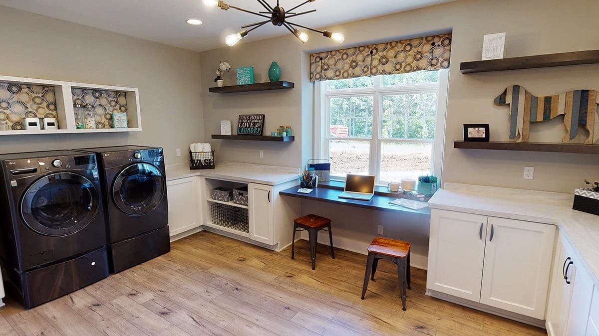 A welcoming foyer draws you into the heart of the Dakota, where you’ll find 10’ high ceilings, an abundance of stately windows, and wood beam ceiling treatments throughout. The great room is highlighted by an impressive stone/wood fireplace and expansive entertaining space that flows into the kitchen. The kitchen is tastefully appointed in every way with impressive maple painted cabinets, over-sized island, stainless steel apron sink, and quartz counter tops. The kitchen features a walk-in pantry, induction cook top, and built-in double-ovens. The dinette right off the kitchen opens up to a cozy hearth room that focuses on a dramatic fireplace. An impressive cathedral ceiling with a unique truss ceiling treatment makes this space a favorite room.