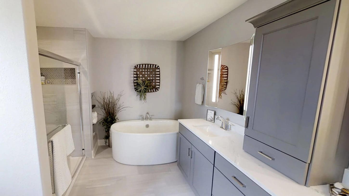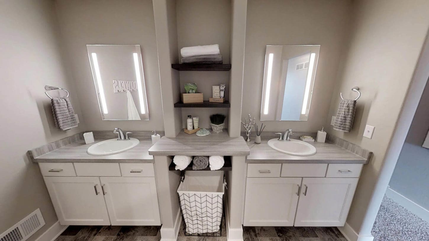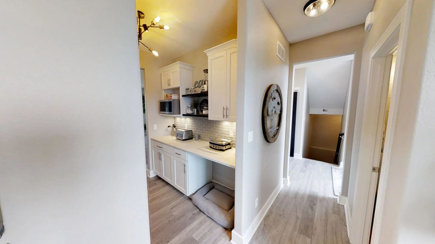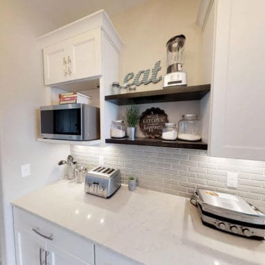 Our latest design trend is our twist on a butler’s pantry, AKA the “messy kitchen.” This space is perfectly tucked away from the kitchen where you can keep your small appliances, prep for a party, or find a place to hide-away your other messes. The “messy kitchen” features a microwave, open shelving, and an abundance of countertop space.