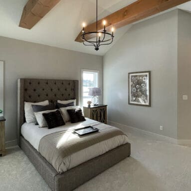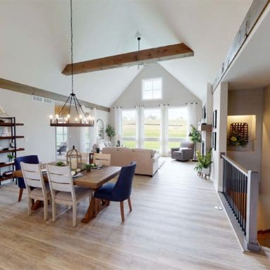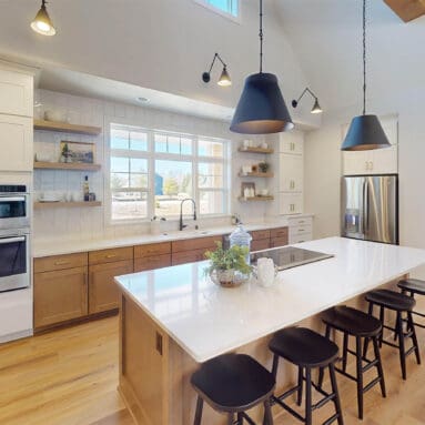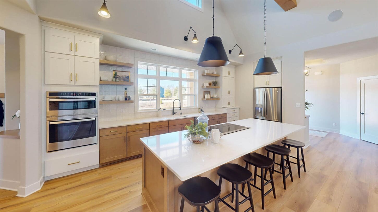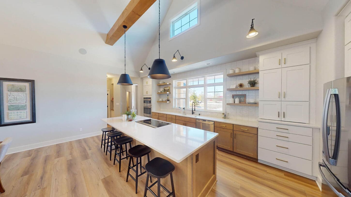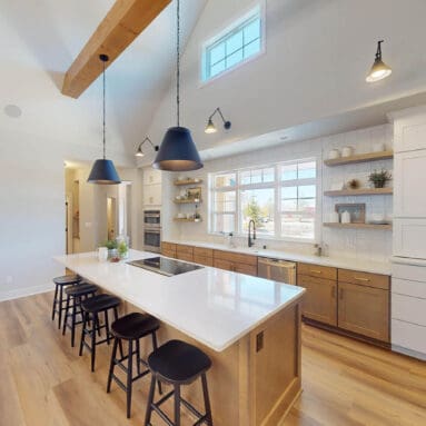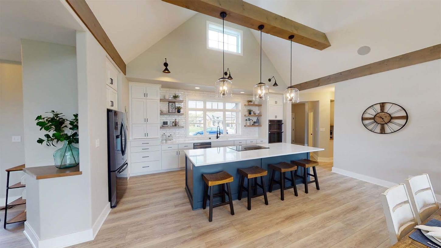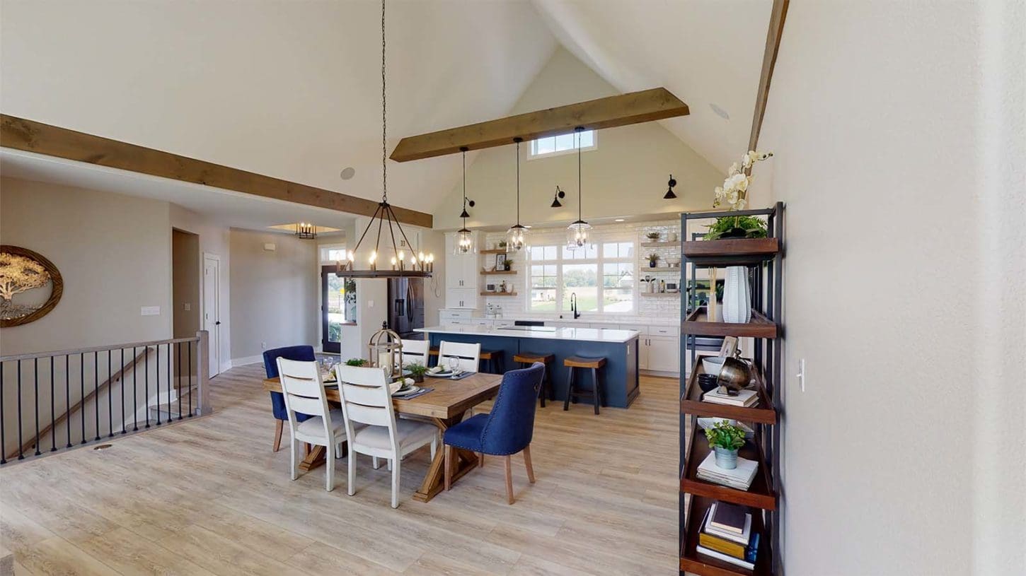 One notable upgrade to our 2021 Parade of Homes model is a stately canted garage. As you step inside The Harper, a soaring cathedral ceiling stretching the length of the home and a huge kitchen window that faces the front yard will immediately capture your attention. Its bright kitchen features a spacious island with colorful lower cabinets and rustic beam treatments overhead. Our signature “Demlang Messy Kitchen,” a twist on the traditional butler’s pantry, helps you stow away life’s little messes.
