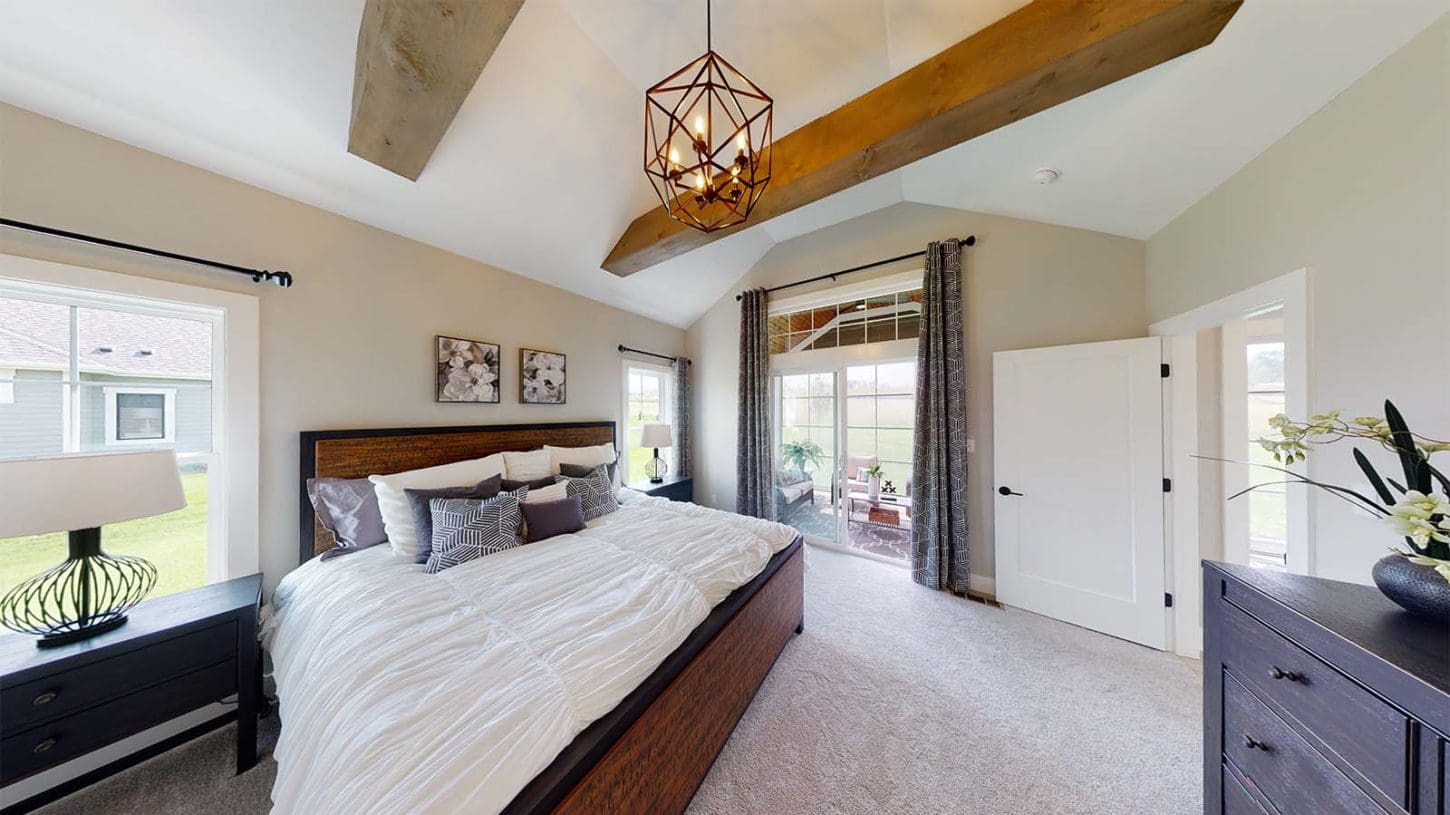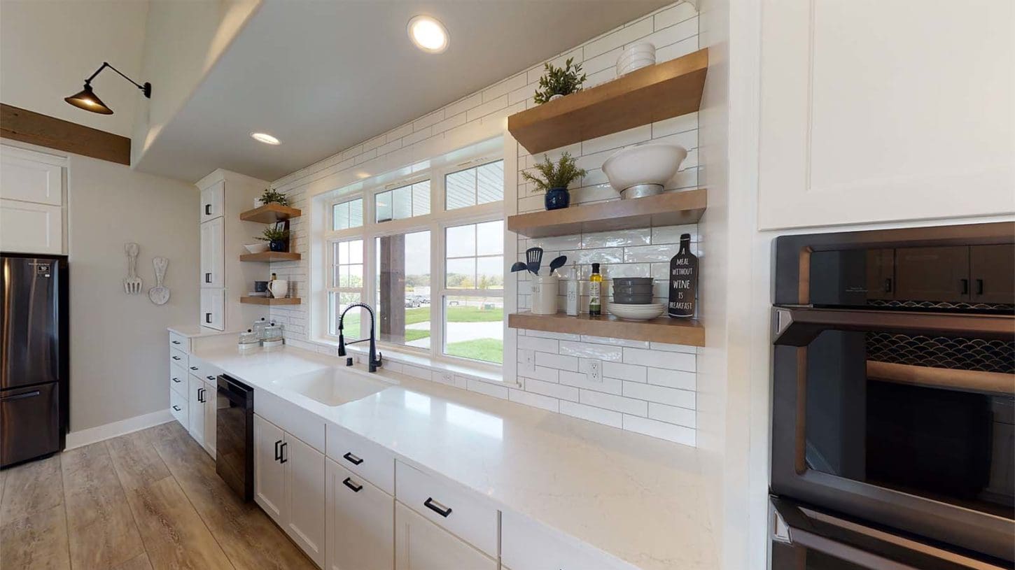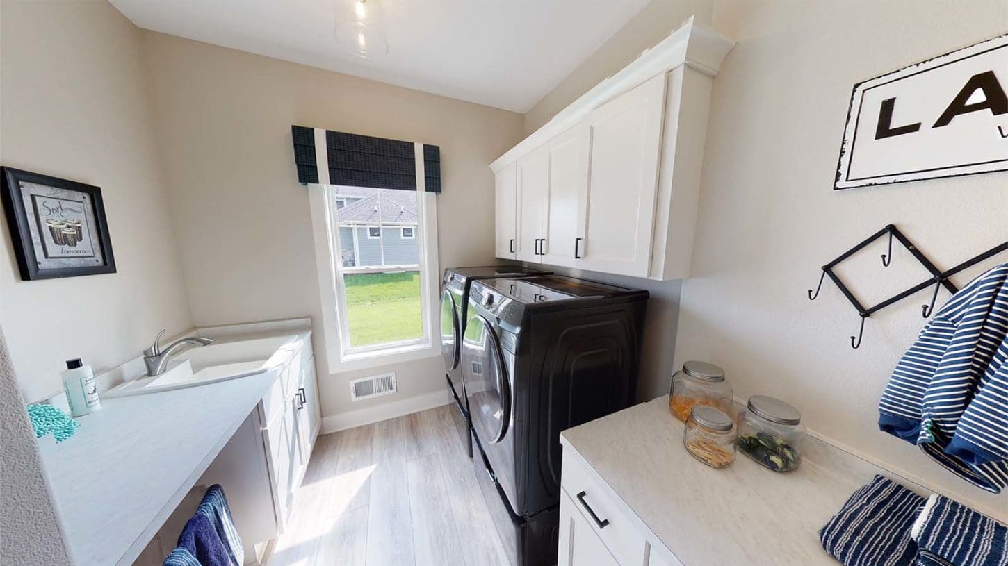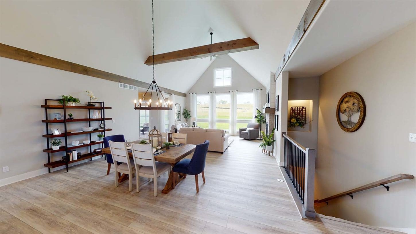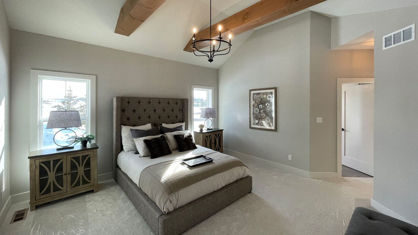 One notable upgrade to our 2021 Parade of Homes model is a stately canted garage. As you step inside The Harper, a soaring cathedral ceiling stretching the length of the home and a huge kitchen window that faces the front yard will immediately capture your attention. Its bright kitchen features a spacious island with colorful lower cabinets and rustic beam treatments overhead. Our signature “Demlang Messy Kitchen,” a twist on the traditional butler’s pantry, helps you stow away life’s little messes.