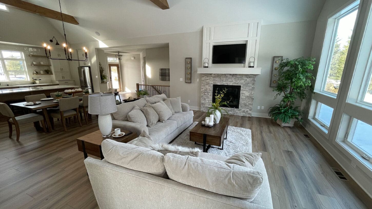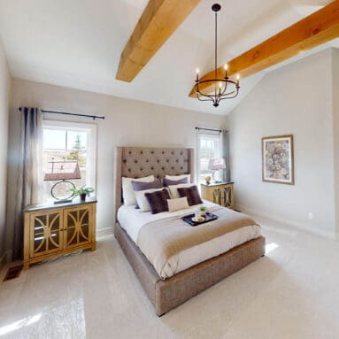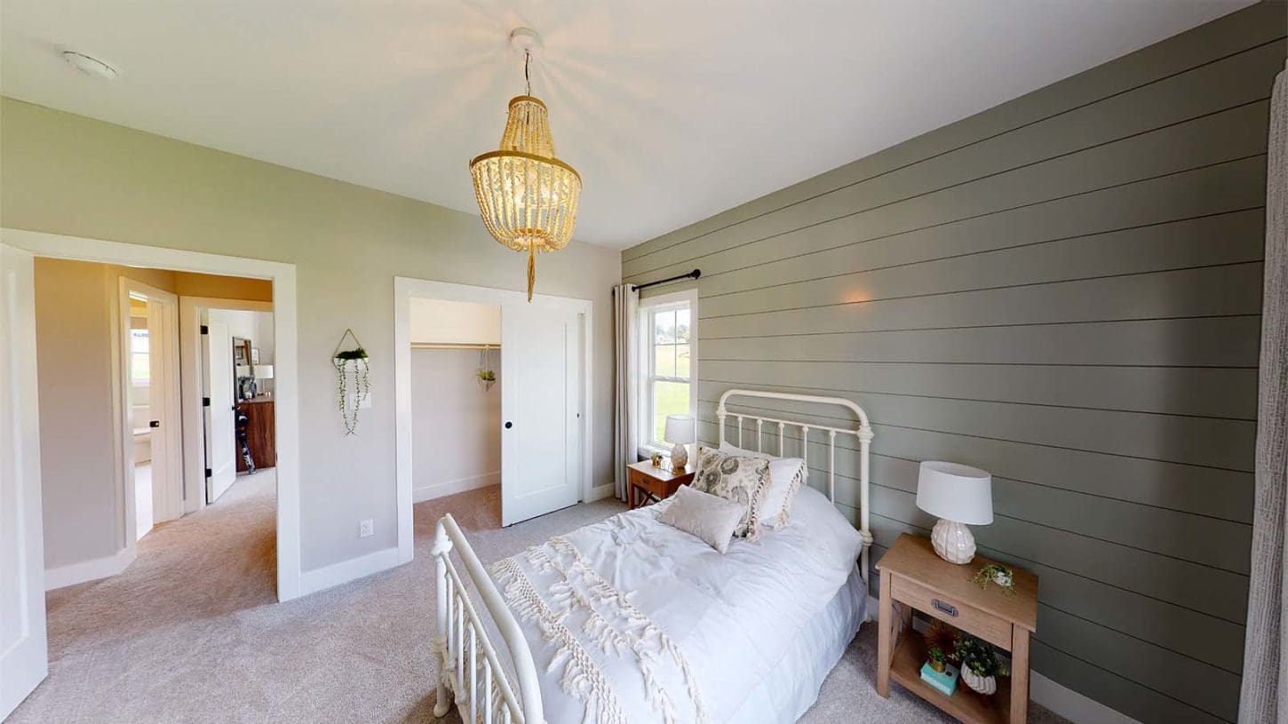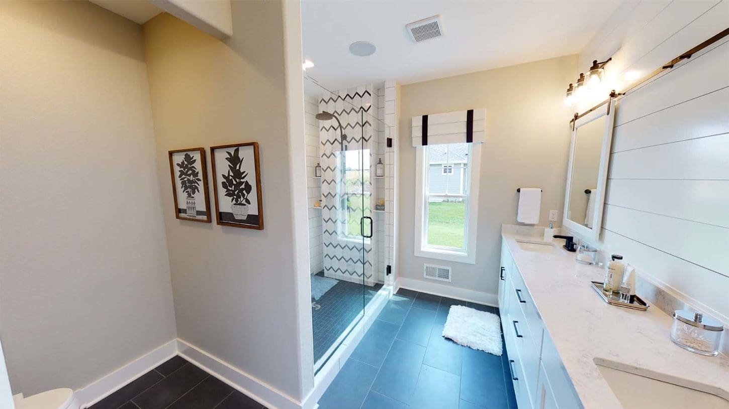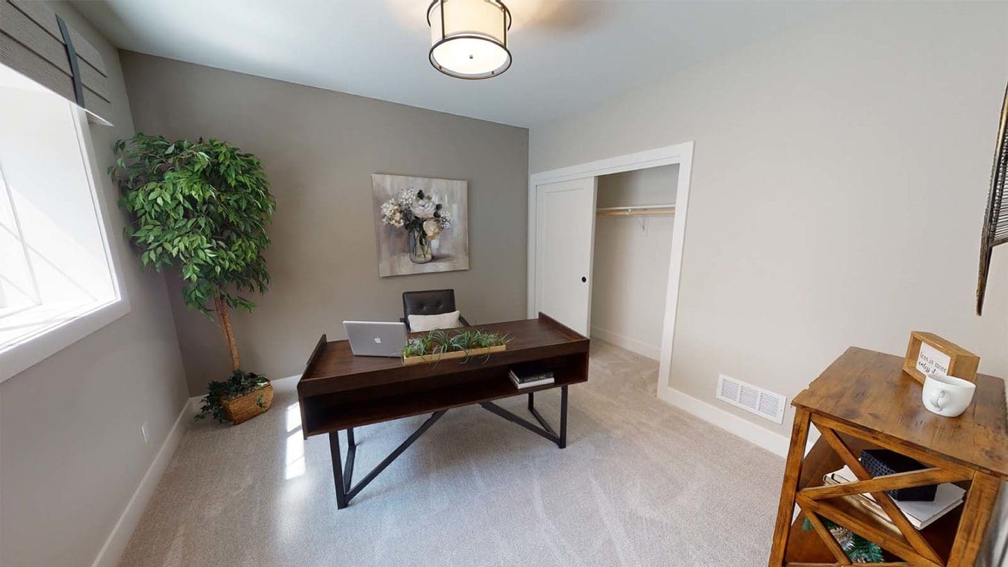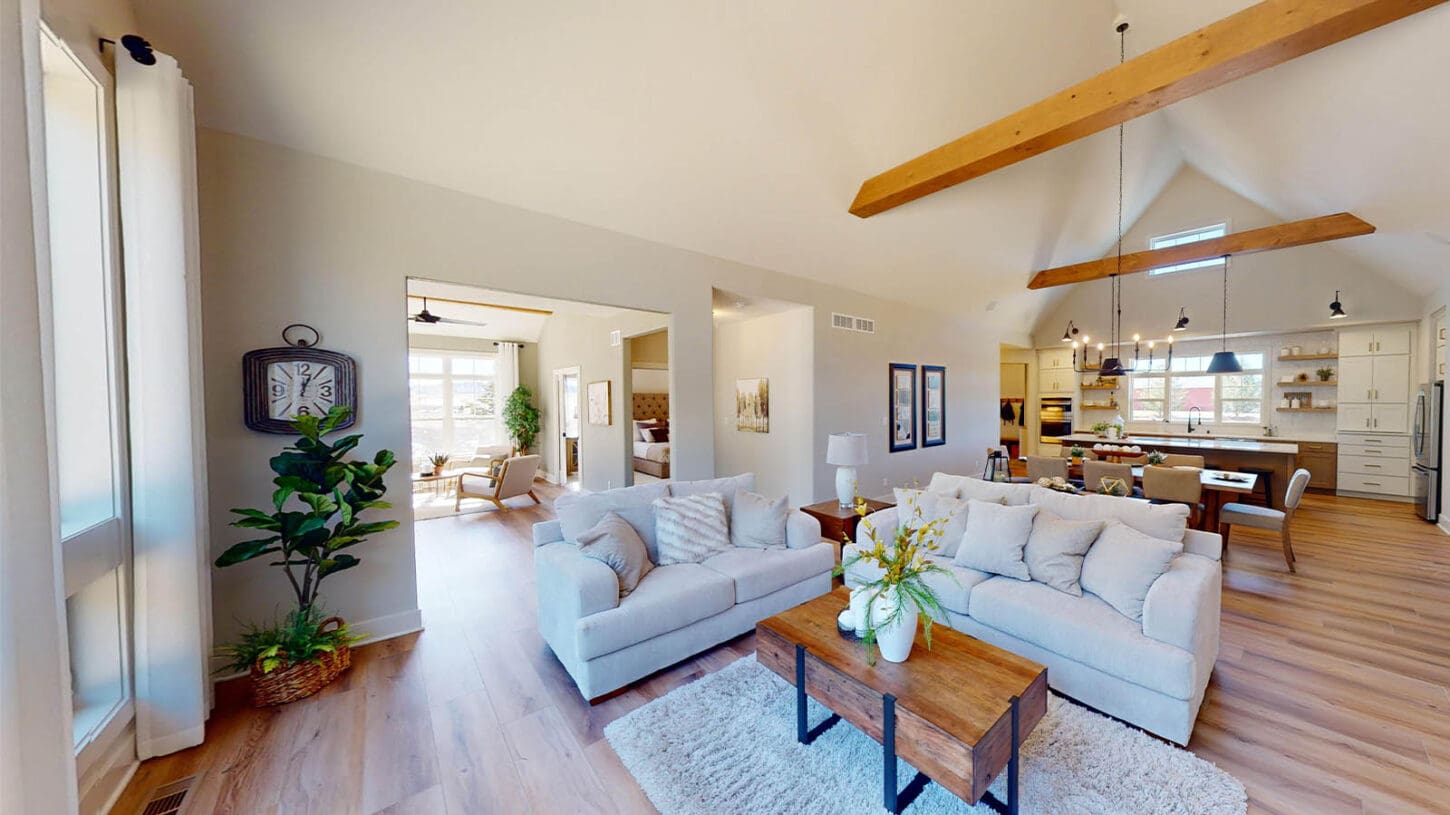 One notable upgrade to our 2021 Parade of Homes model is a stately canted garage. As you step inside The Harper, a soaring cathedral ceiling stretching the length of the home and a huge kitchen window that faces the front yard will immediately capture your attention. Its bright kitchen features a spacious island with colorful lower cabinets and rustic beam treatments overhead. Our signature “Demlang Messy Kitchen,” a twist on the traditional butler’s pantry, helps you stow away life’s little messes.