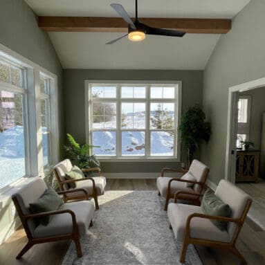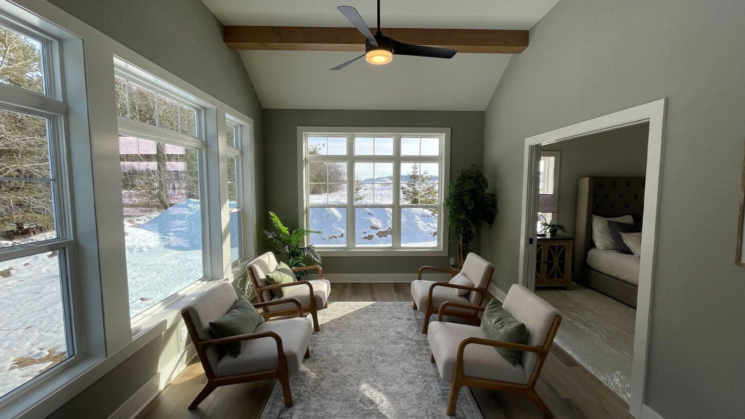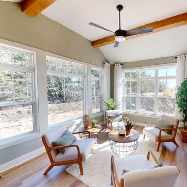 Adjacent to the dinette, the great room features a stone fireplace, rustic beams, and floor-to-ceiling windows. The 3.5-season living space gives you yet another cozy space for at least three bug-free seasons. What a bonus!