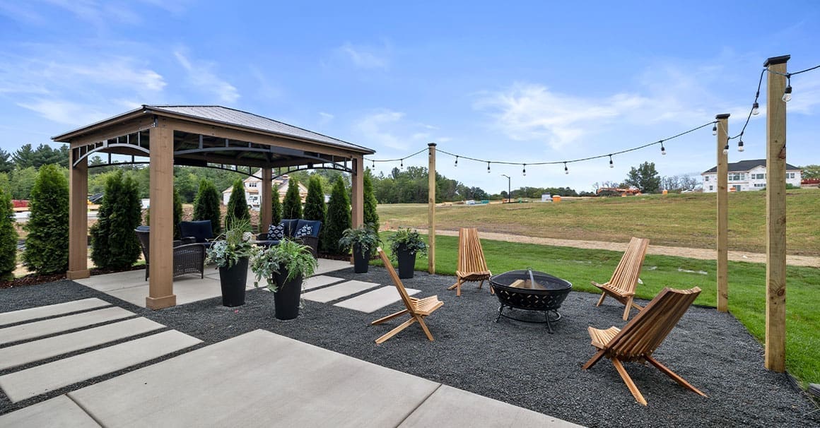 Parade of Homes model, The Lexi, backyard entertaining space featuring a fire place and sitting furniture under a gazeboParade of Homes model, The Lexi, exterior back yard showing off the sitting area with fireplace.Parade of Homes model, The Lexi, outdoor front exterior.